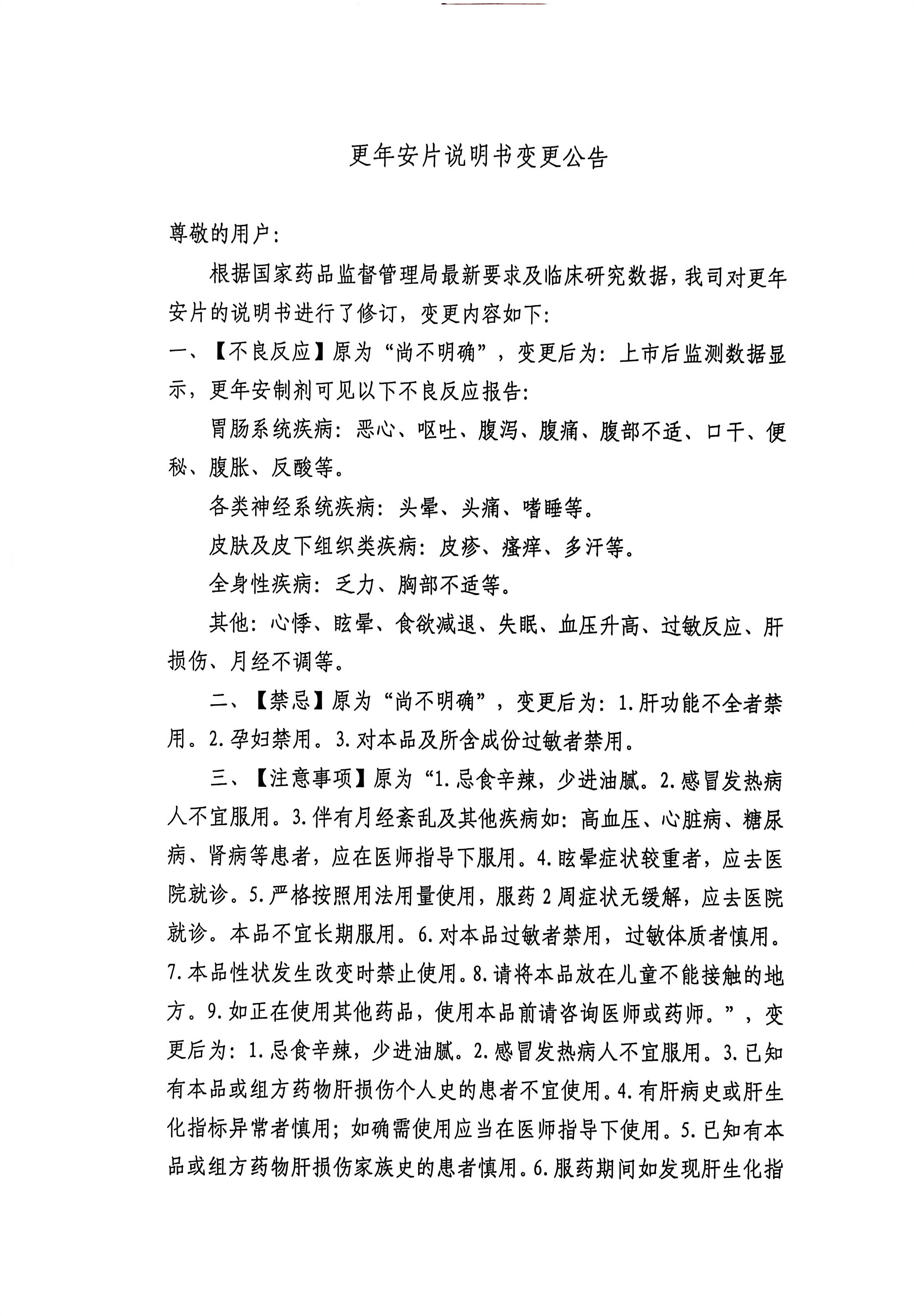 更年安片说明书变换通告